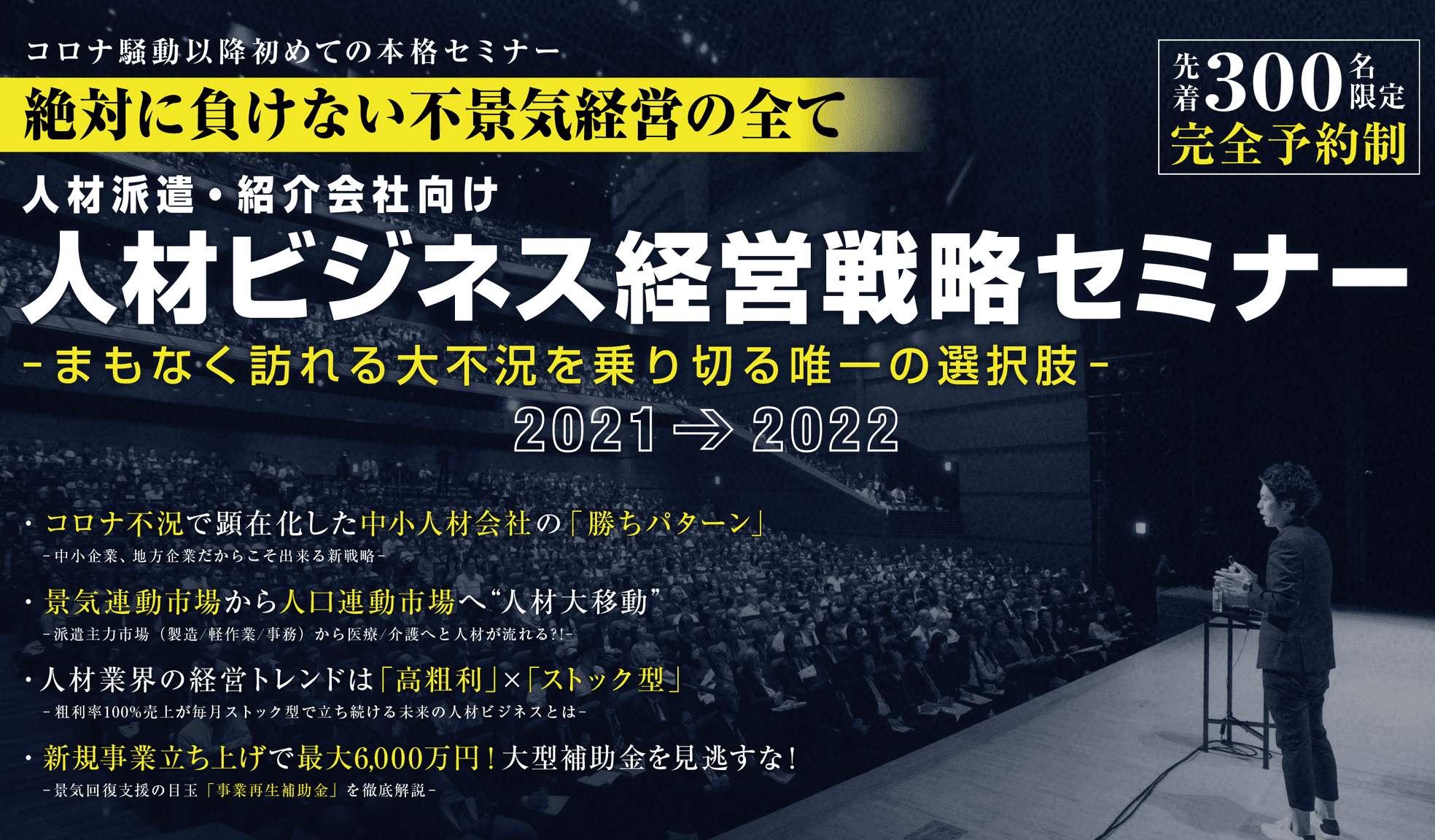 株式会社HRForceは、この度「コロナ不況下の人材業界の見通し」「不景気経営の鉄則」「人材募集難を今すぐ解決する手法」「国の補助金を用いてリスクなく次の基幹事業を創る方法」などを含め、人材派遣・紹介会社様向けに、これからの人材業界の経営戦略についてお伝えするセミナーを6会場(札幌/名古屋/福岡/大阪/東京/金沢)にて開催いたします。