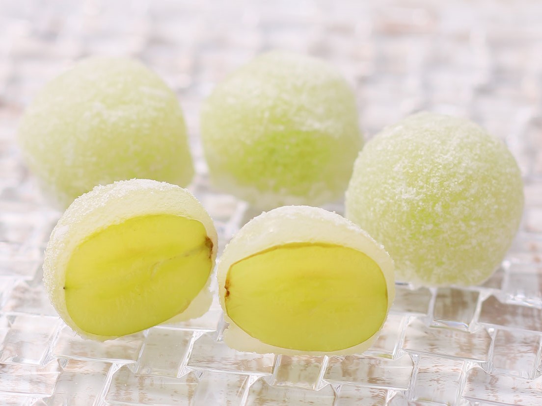 羽曳野市のG-Grape Farmのシャインマスカットをわらび餅風の生地で丸ごと包んだ大福。表面には氷餅をあしらっています。天然素材酵素、堆肥、海藻などを用いた土づくりにこだわっています。