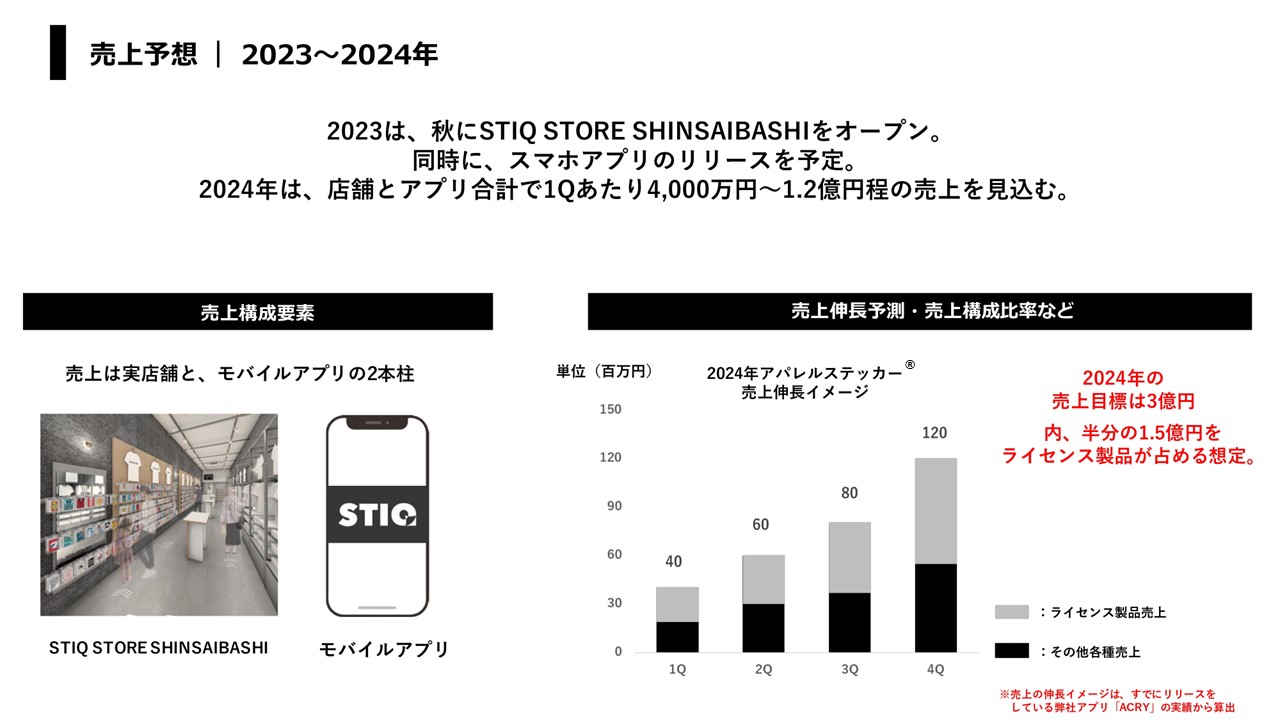 アパレルステッカー®は独自開発した伸縮性や耐水性のあるタックシールで、綿、ポリエステル、ジーンズ生地など様々な布製品に使えるだけでなく、帽子など曲面のある場所、ポケットの内側などにも貼り付け可能です。貼り付け方法もアイロンを2回使うだけ。好きなデザインを、好きな位置に貼付けられる「体験」と「感動」を最短1分で提供します。当製品を使ったこのサービスを「STIQ」と名付け、スマートフォンアプリでの提供に合わせて、ステッカーの購入から貼り付け体験までできる実店舗を関西の旗艦店「STIQ STORE SHINSAIBASHI」としてこのたびオープンします。当店では、アパレルステッカー®や無地Tシャツを販売するほか、2階では試着、アイロンで購入商品を貼り付けることがご体験いただけます。