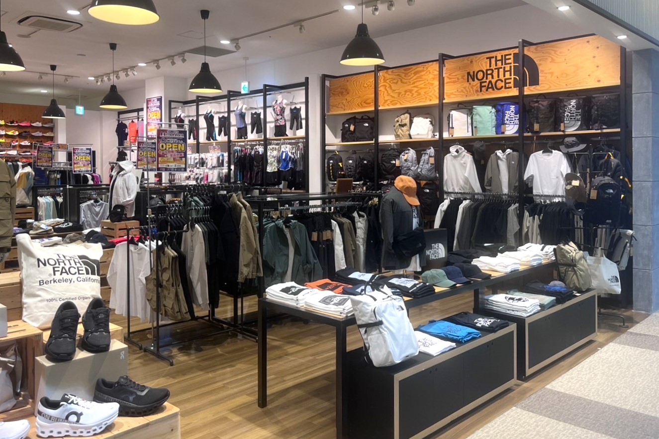 ファミリーでの来店が多く、館内にスポーツクラブがあるフォレオ大津一里山ですが、スポーツショップがありませんでした。当店では、ファミリー層や競技スポーツをする学生をターゲットに、ランニング、テニスやバドミントン、サッカーなどの競技スポーツ用品、アウトドアなどをメインに約200ブランド、約3000アイテムの商品をそろえています。「ザ・ノース・フェイス」のアパレルやシューズなどを集めたコーナーをはじめ、スイスの「ON(オン)」やアメリカの「HOKA(ホカ)」といった海外ブランドのウォーキングシューズやランニングシューズなどファッション性の高いブランドもそろえています。