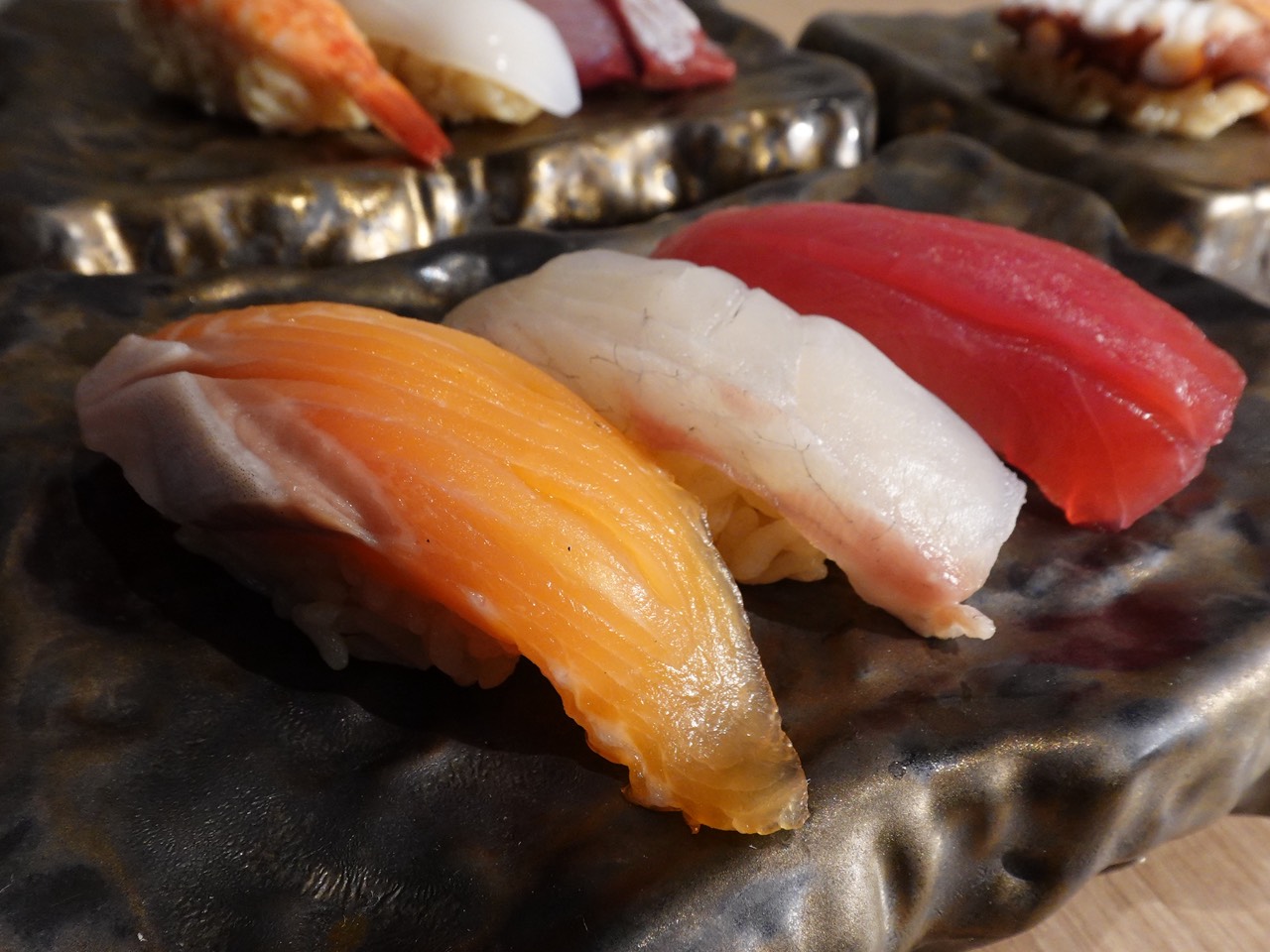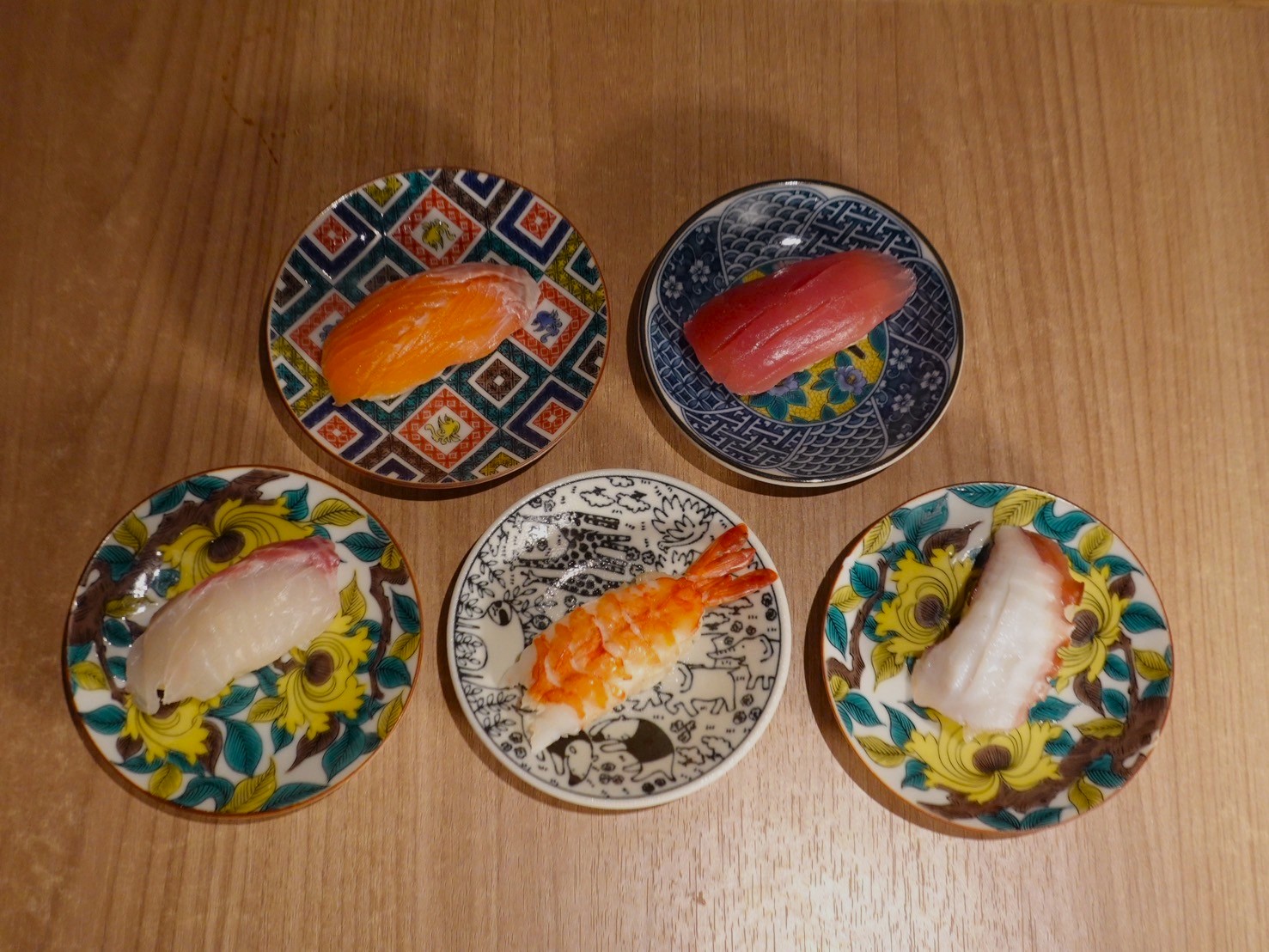 写真左上から時計回りにサーモン、マグロ赤身、たこ、エビ、真鯛