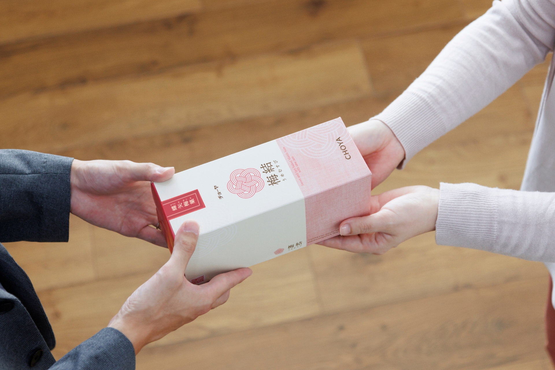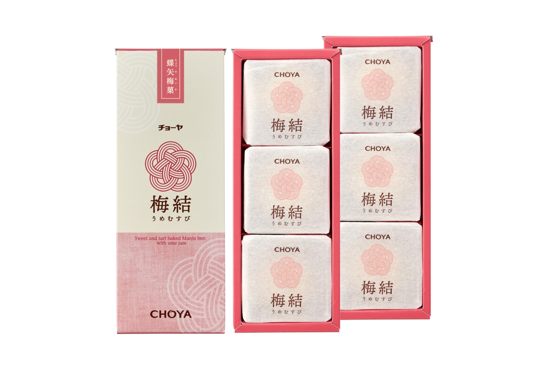 北海道産大手芒豆と完熟南高梅を使用したしっとりとした食感の白餡と、完熟南高梅のさわやかな酸味と果実感を味わえる特製梅ジャムを、昔ながらの素朴で懐かしい味わいの生地で包んだ「CHOYA 梅結」。「梅結び」の水引をあしらったパッケージは、贈り物にぴったりな華やかなデザインです。
