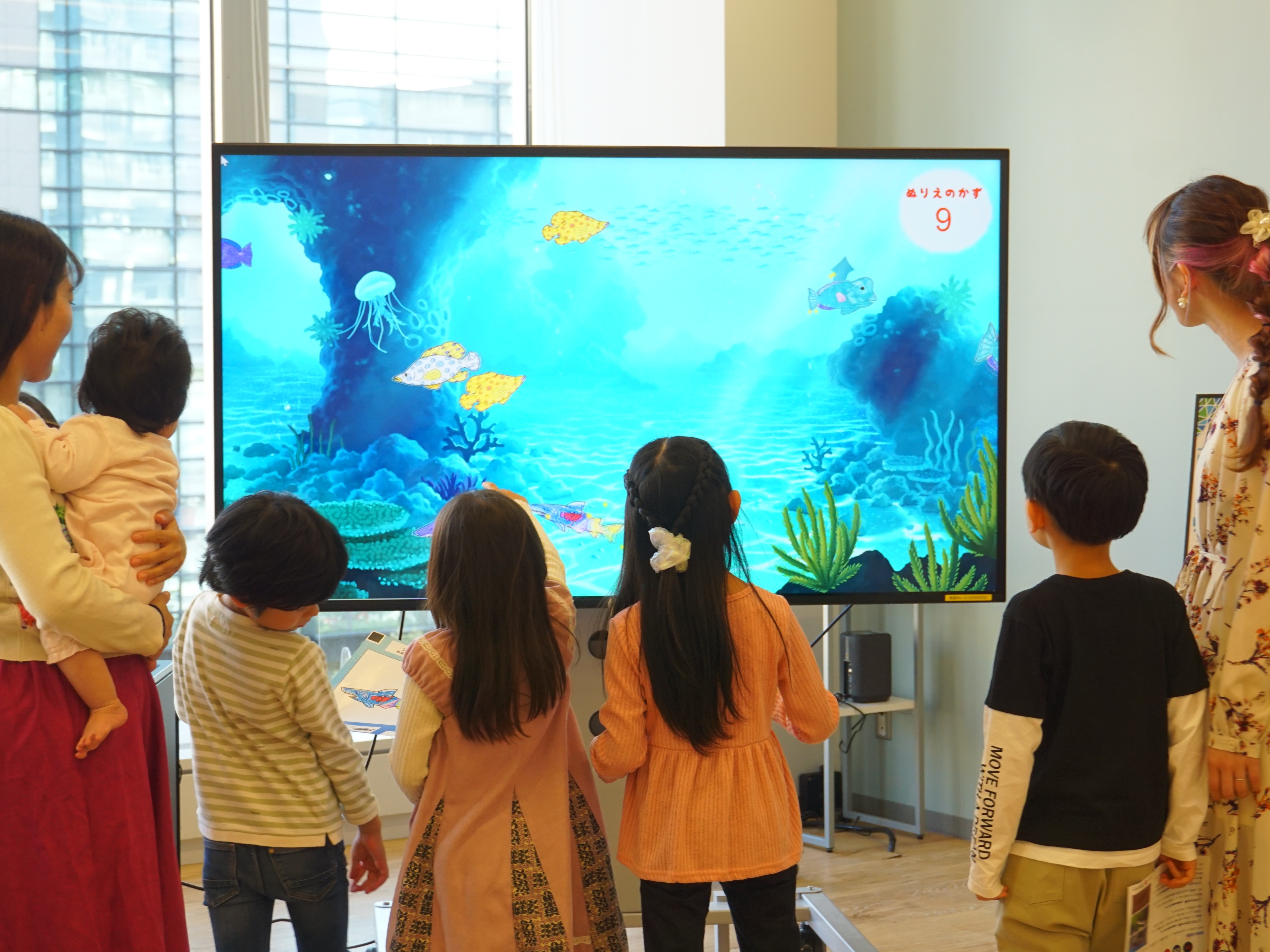 自分が描いたぬりえの生き物が大画面で泳ぎ出す!