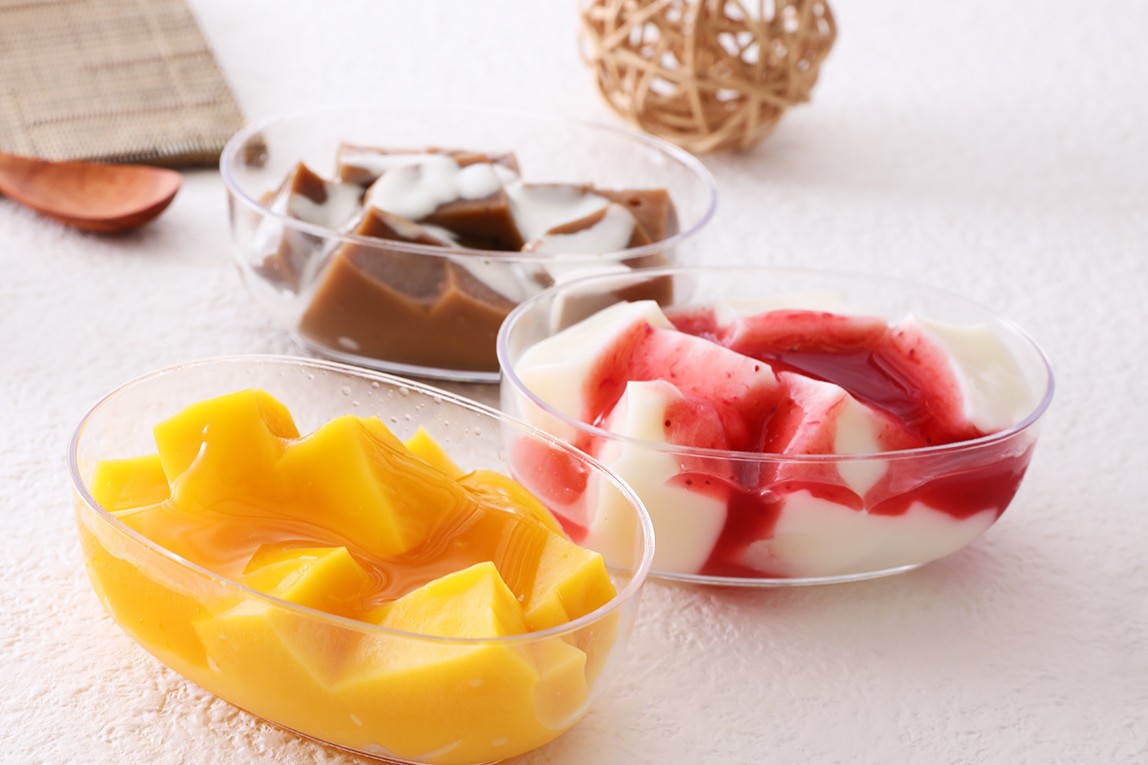 水をミルクに置き換えて炊き上げた新スタイルの洋風わらび餅。いちごミルク味、カフェオレ味、マンゴー味の3つの味をお楽しみいただけます。