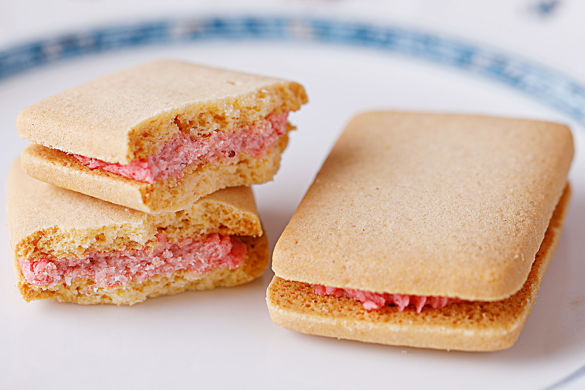 自家農園の完熟いちごを使ったクリームをクッキーで挟みました。着色料を使用せず、自然のままの澄んだピンク色が特徴です。