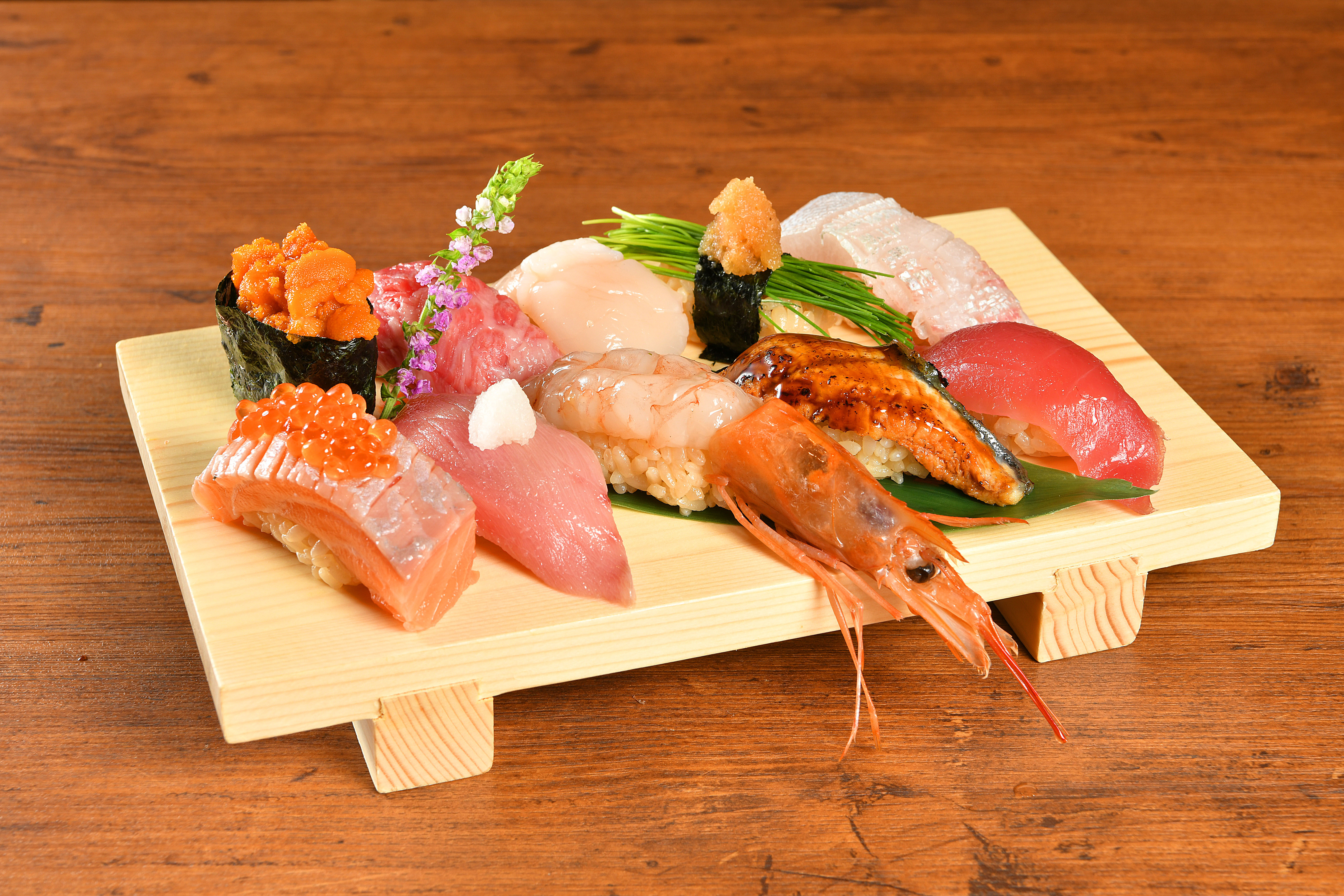 寿司は1貫180円~、マグロや鰻などを含む鮨5種盛り(梅)は980円と、リーズナブルなお値段ながら、ネタは大きく分厚くカットし、高級感を感じていただける本格派の寿司を提供いたします。