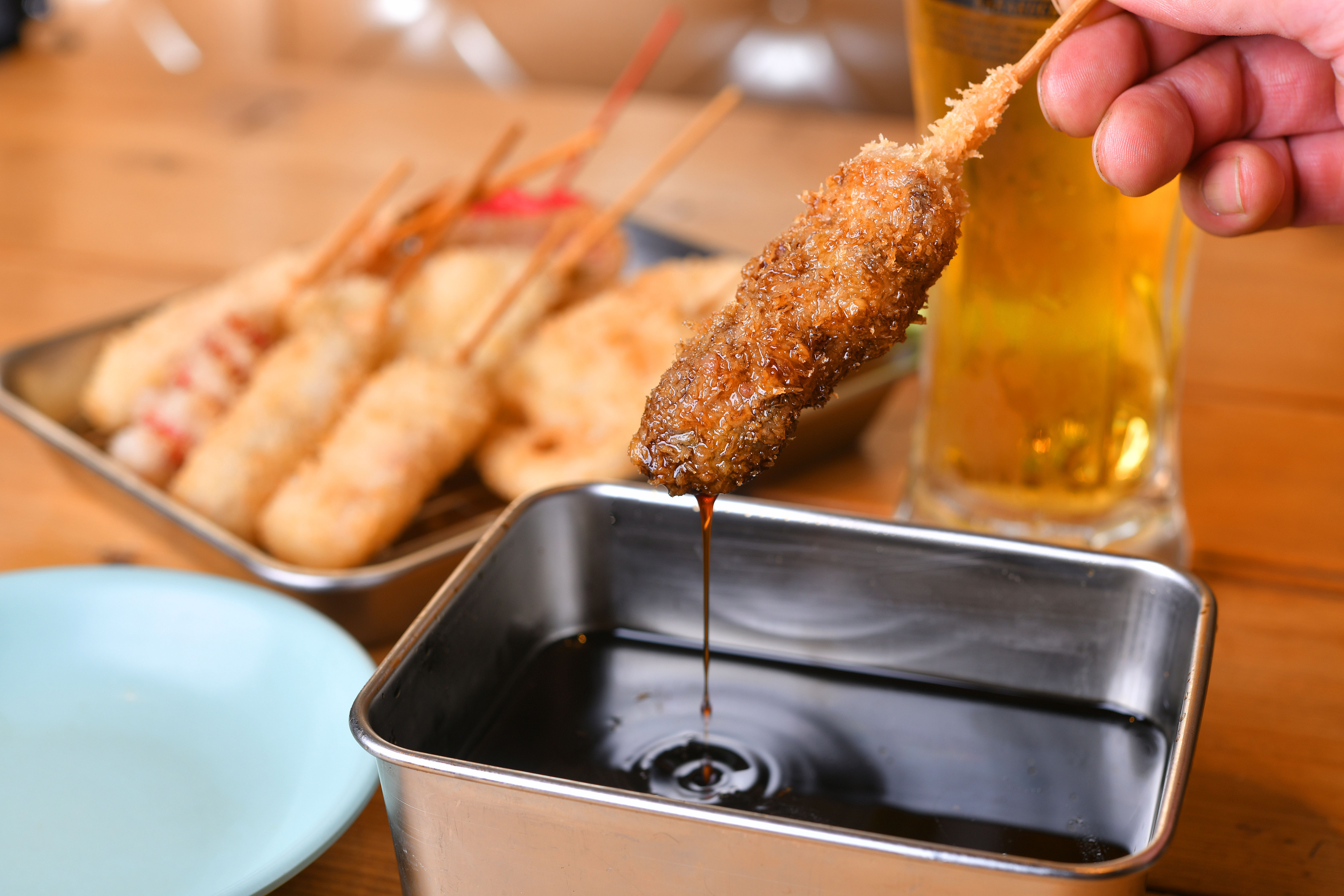 大阪屈指の観光地「新世界」に本店を構える串かつの老舗“ぎふや”は、創業大正5年、本年で109年を迎えました。創業当時から受け継がれる串かつは、現在も全店共通の看板メニューとして多くのお客様に親しまれています。揚げたての串かつは、二度漬け厳禁の特製ソースはもちろん、さっぱりとしただし酢でもお楽しみいただけ、素材の旨味を存分にご堪能いただけます。