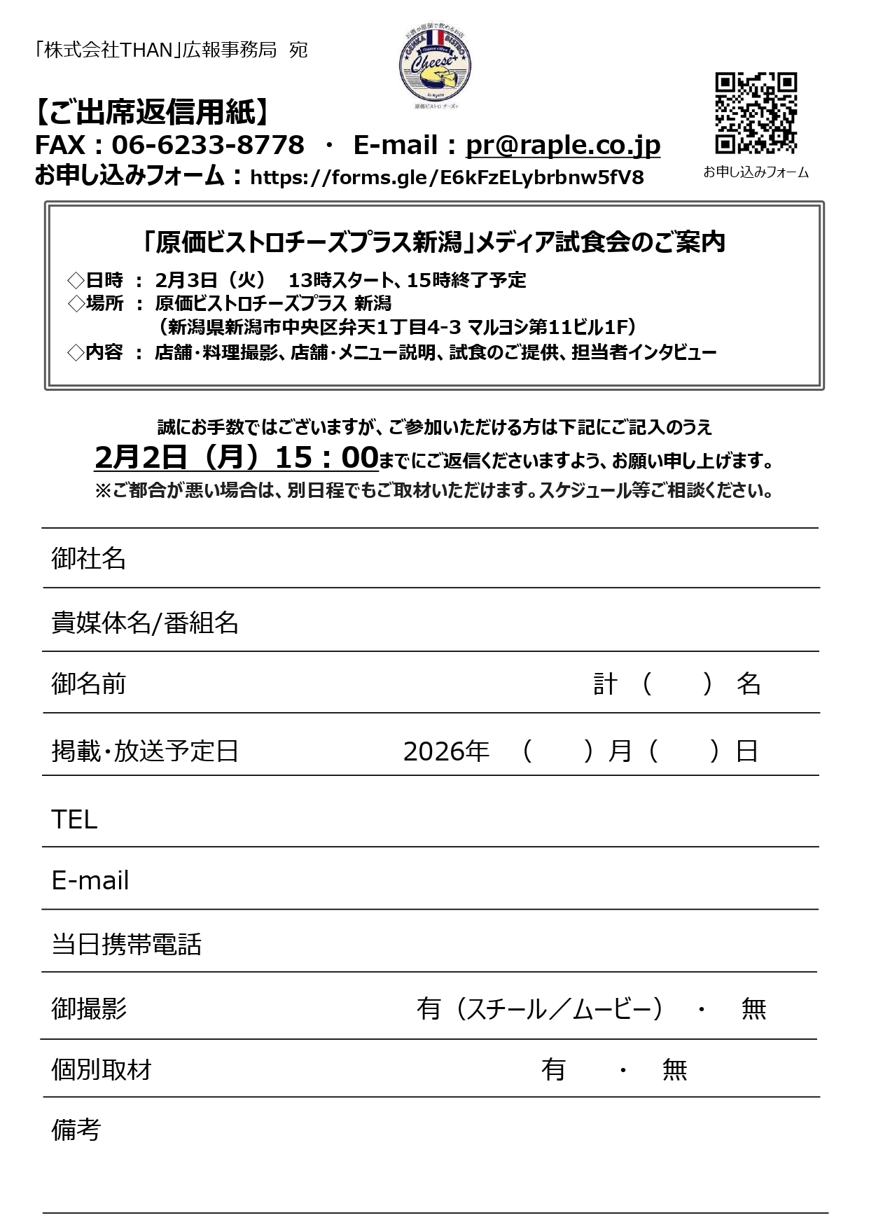 飲食店を運営する株式会社THAN(本社:京都府京都市、代表取締役:織田 裕貴)は2026年2月5日(木)、創作チーズ料理と原価でお酒が楽しめるビストロ「原価ビストロチーズプラス新潟」(新潟県新潟市中央区弁天1丁目4-3 マルヨシ第11ビル1F)をオープンします。