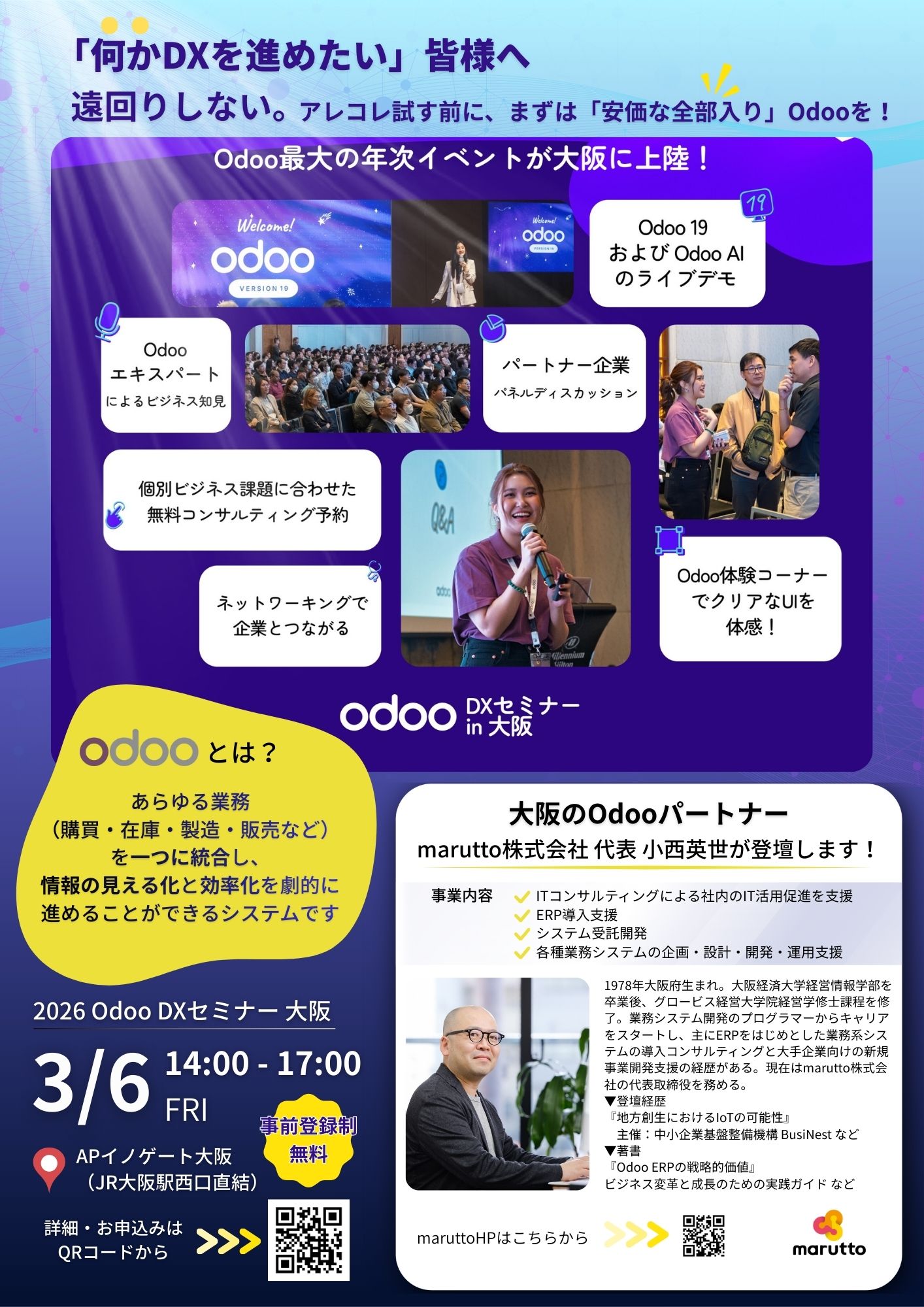 IT活用で企業の「ゆとり」を創造するITコンサルティング企業、marutto株式会社(本社:大阪市、代表取締役:小西英世)は、2026年3月6日(金)に大阪で初開催される「2026 Odoo DXセミナー」にパートナー企業としてスポンサー参加し、弊社代表の小西が登壇することをお知らせいたします。