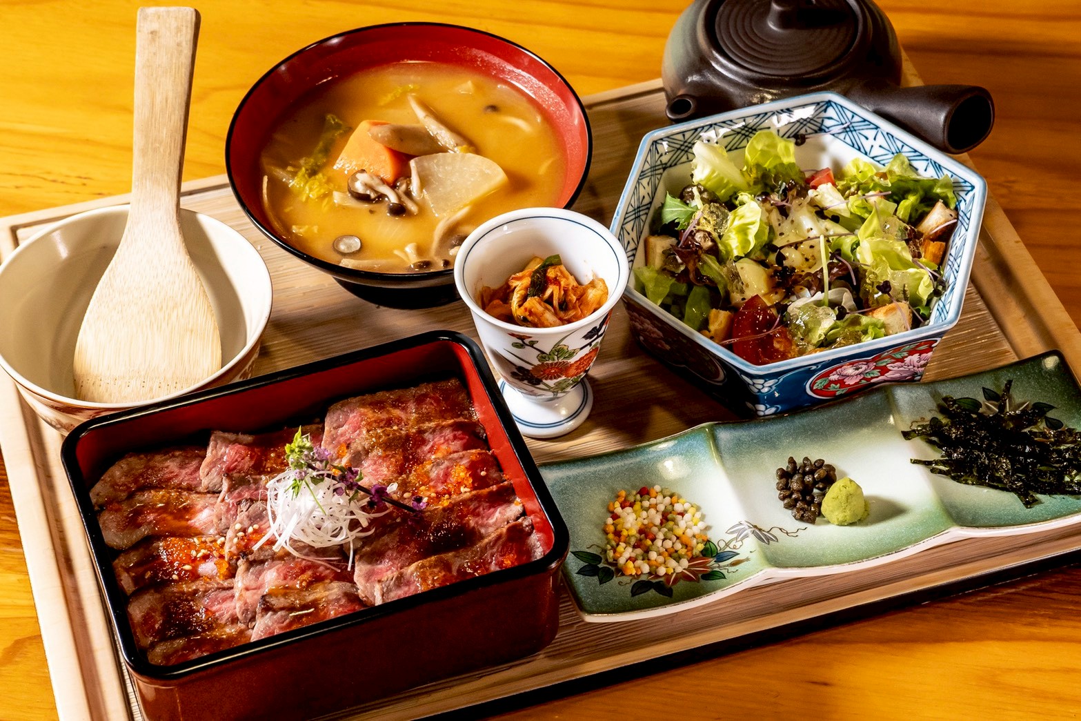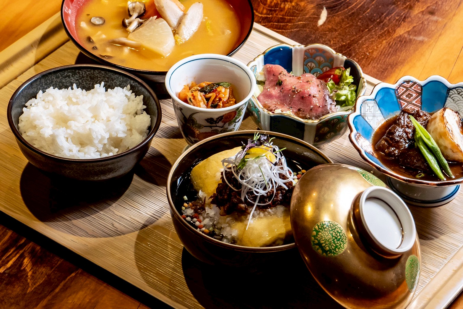 新ランチメニューは3種類。「餡掛け出汁巻き~和牛しぐれ煮のお膳~」(2,180円)は、飲めるほどふわとろに巻いただし巻き玉子を和風出汁が香る餡に浮かべ和牛のしぐれ煮をのせました。「特撰和牛のひつまぶし御膳」(3,480円)は、香ばしく焼き上げた特撰和牛を和牛しぐれ煮と大葉香る味ご飯に重ねた贅沢な一品。まずはそのまま、続いて薬味で、最後は牛骨の和風出汁で。三度楽しめる和牛まぶしです。「大トロサーモンのレアカツのお膳」(2,290円)は、脂がたっぷりとのった大トロサーモンをサクサクとした軽い食感が特徴のカダイフで包んで揚げました。しば漬けタルタルの爽やかな酸味とワサビ香る岩のりソースは、サクとろ食感のレアカツとの相性抜群です。
