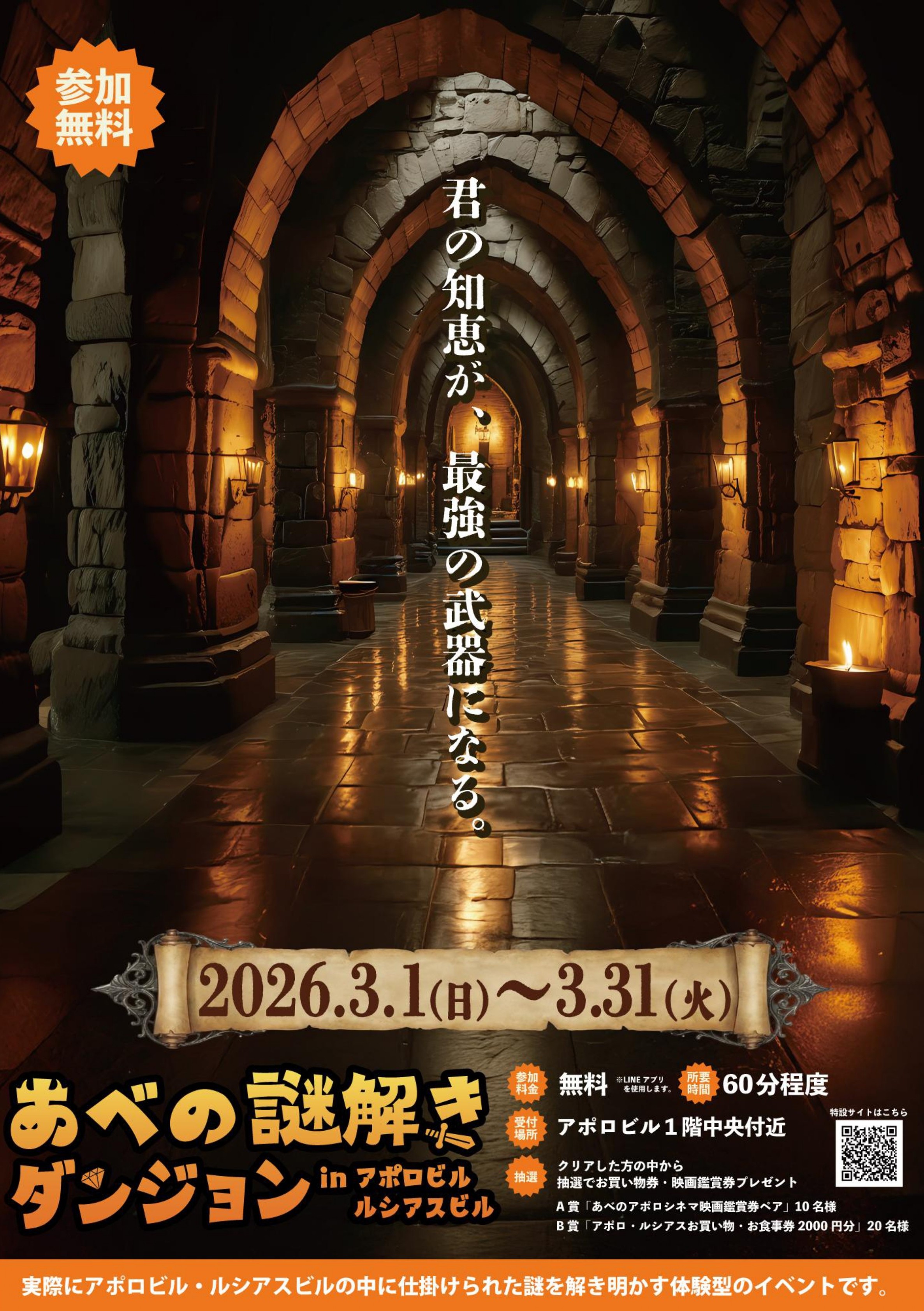 光明興業株式会社(大阪市中央区)が運営する謎解き施設「時解~TokiToki eScape cafe~(トキトキ エスケープカフェ)」は3月1日(日)~31日(火)の間、あべのエリアの商業施設「きんえいアポロビル」「あべのルシアス」(大阪市阿倍野区)で無料周遊型謎解きイベント「あべの謎解きダンジョン」を開催します。