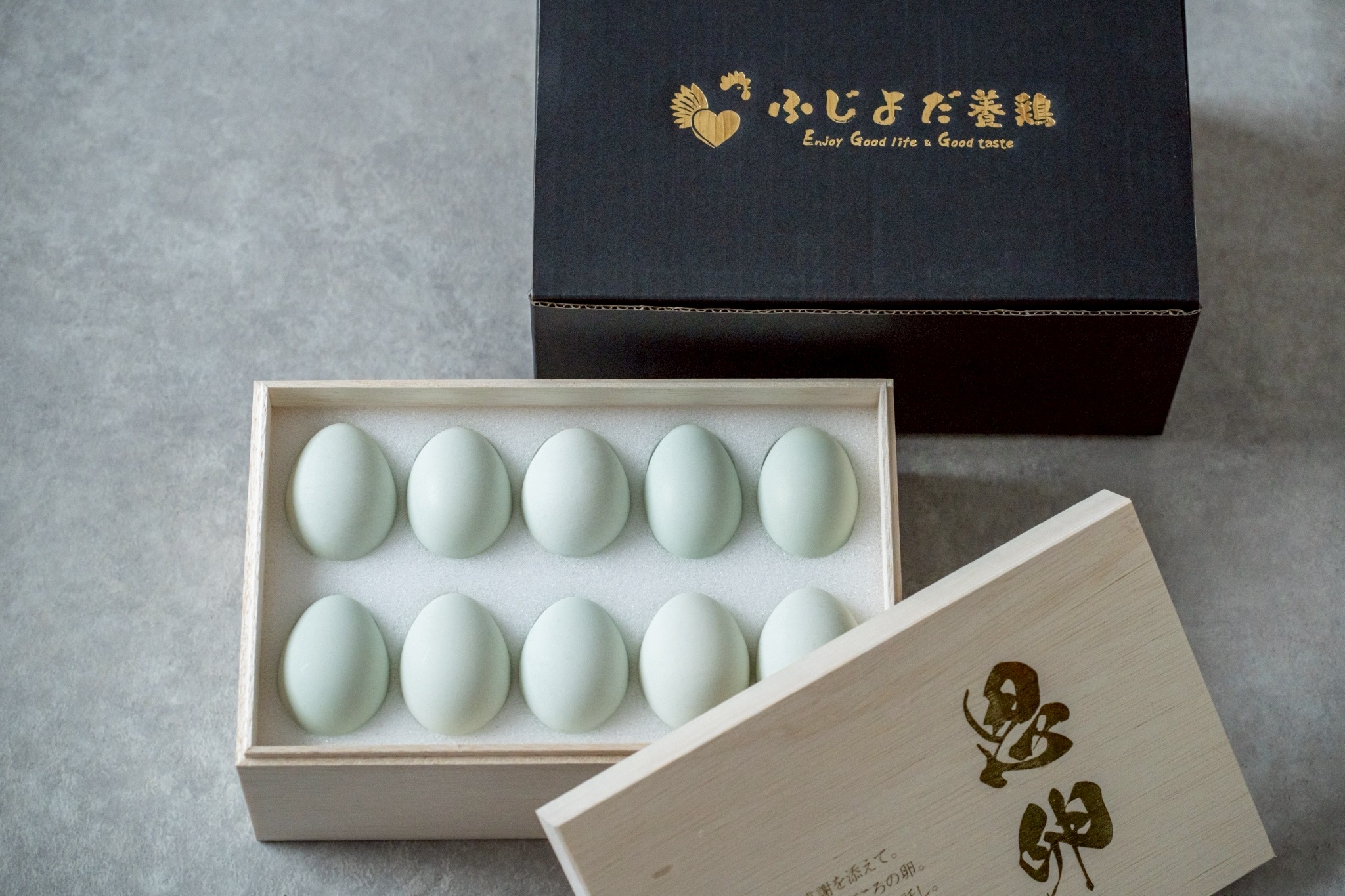 ふじよだ養鶏は、全国の採卵鶏の中でも0.015%(1億3000万羽のうち、2万羽)しかいない「アローカナ」が産む卵のみを扱っています。ストレスの少ない環境で育てるために荒れ地の状態から余田自身が開拓・整備し、 雄・雌一緒に飼育する「完全平飼い」の環境を設計。飼料も牡蠣殻、大麦、ぬか、有機野菜、動物性たんぱく質などを独自にブレンドし、発酵させた最上級のものを与えています。生産数が限られることから、これまでは提供数が予測しやすい家庭向けの定期便(サブスクリプション)として展開し、なかには1年先まで買えない商品もございます。その一方で「お世話になった方へ贈りたい」というギフト商品としての要望も絶えませんでした。ギフト市場も近年では毎年伸長していることもあり(※)、贈答用商品として「恩玉」を販売することにしました。色・形・サイズともに最高ランクの卵をピックアップし、特製木箱に詰めてお送りします。大事な人への「ありがとう」を伝えるギフトとしてご利用ください。