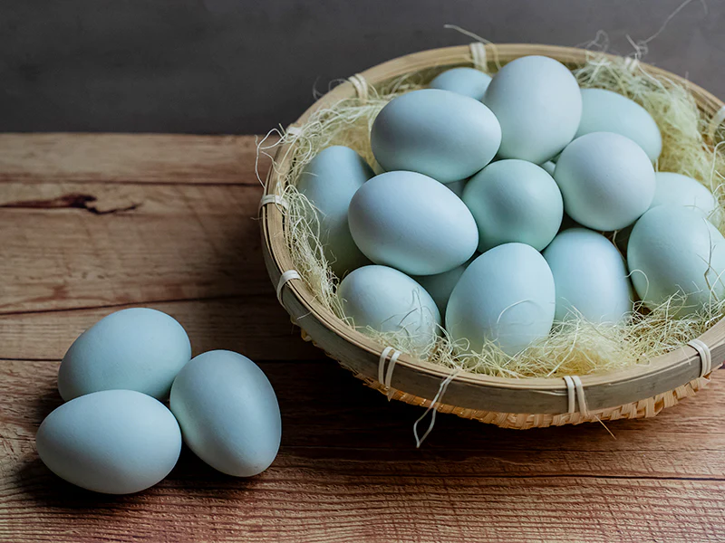 特 徴:翡翠のような青い殻。高い栄養価と濃厚なコク 卵は100%近くが有精卵となっています