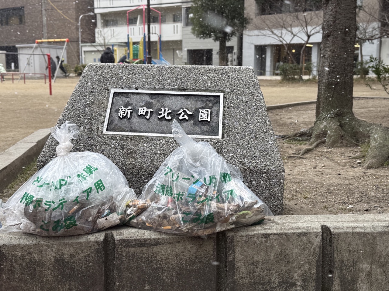 2026年2月8日、大阪市内は冬の冷え込みが一段と厳しく、気温は低く、空からは細かな雪が舞い続いていました。この日の新町北公園は、普段よりも人影が少なく、凛とした空気に包まれていました。そのような寒さの中、ドライヘッドスパサロン「ドライヘッドスパ&高濃度水素サロン 巡~meguri~ 堀江」(以下、「巡~meguri~堀江」)のスタッフ一同が、地域美化を目的とした清掃活動を実施いたしました。