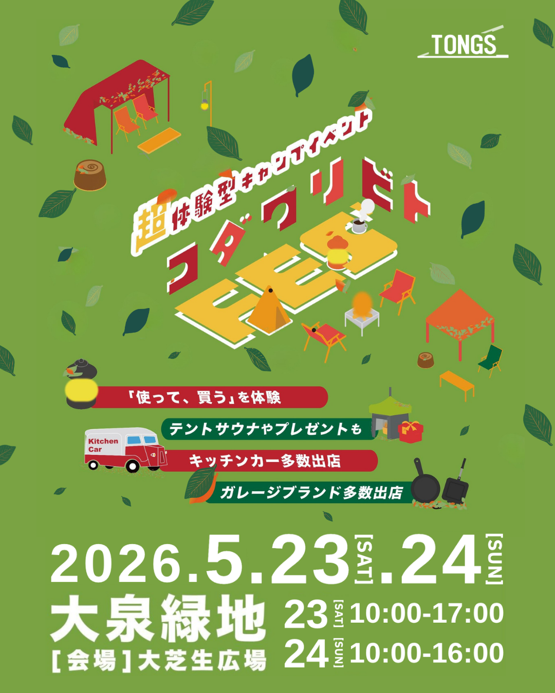 TONGS合同会社(所在地:東京都港区、代表:一丸昂太)は、ガレージブランドが作るアウトドアギアを実際に使用し、「試す」ことができるイベント「コダワリビトFES」 を、 2026年5月23日(土)・24日(日) の2日間、大阪府堺市・大泉緑地にて開催いたします。