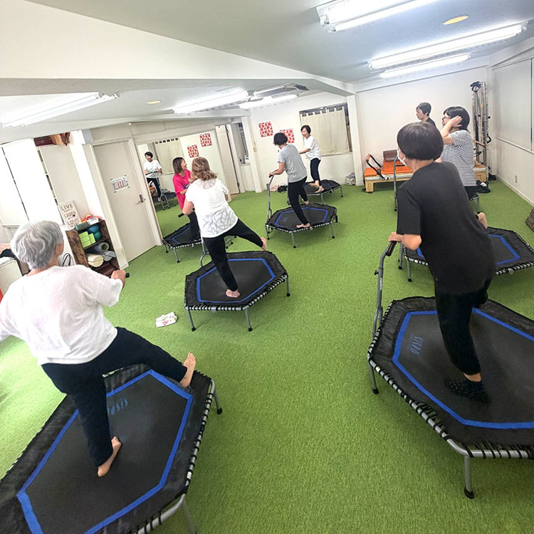 実際のレッスンでは、跳び続けることを前提とせず、トランポリン上での軽い動きとフロアでの運動を組み合わせながら進行します。モニターレッスンは定員7名で満員となり、参加者の中には70代の方もいらっしゃいました。「これならできる」「久しぶりに身体を動かして気持ちよかった」といった声が寄せられています。